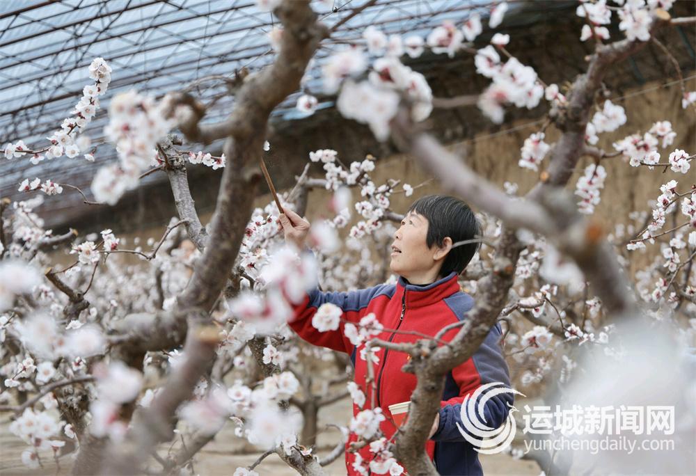 2月3日,夏县尉郭乡一果农在杏树大棚内为杏花授粉。