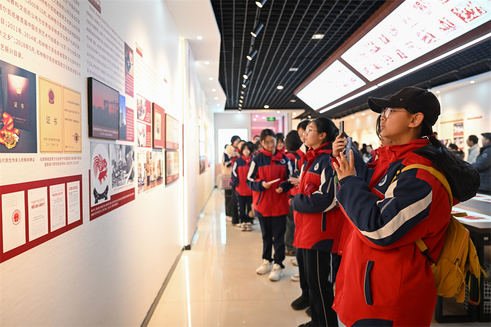 2月4日,内蒙古大学附属中学学生在内蒙古呼和浩特市和林格尔土城子国家考古遗址公园剪纸陈列馆参观。