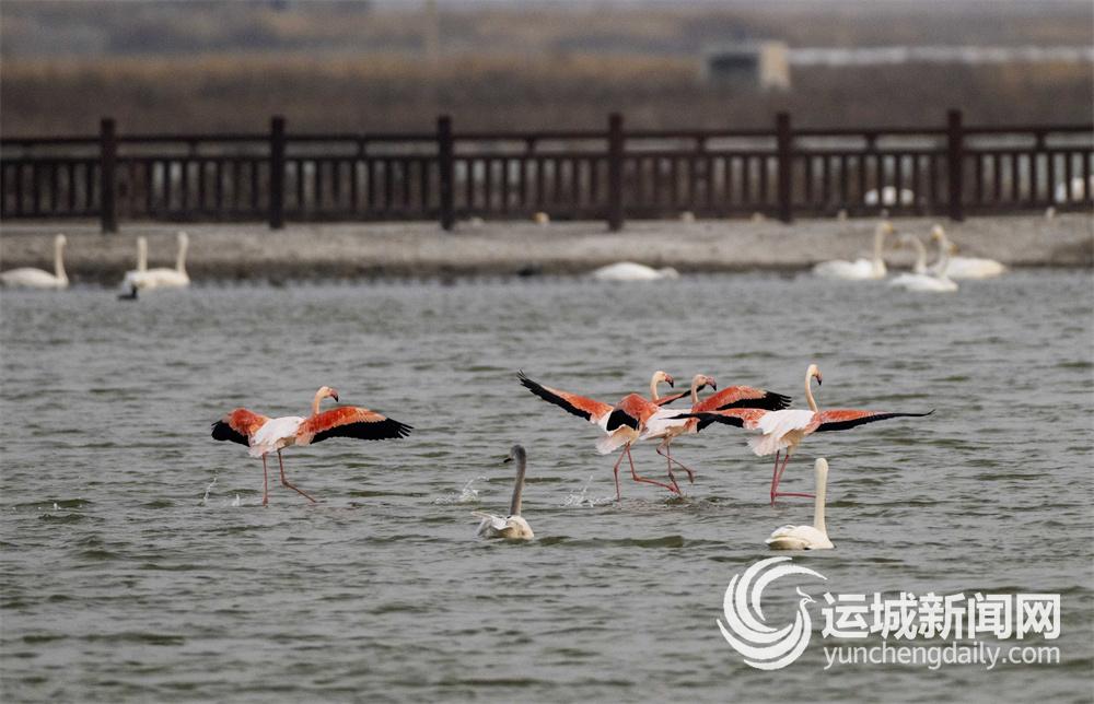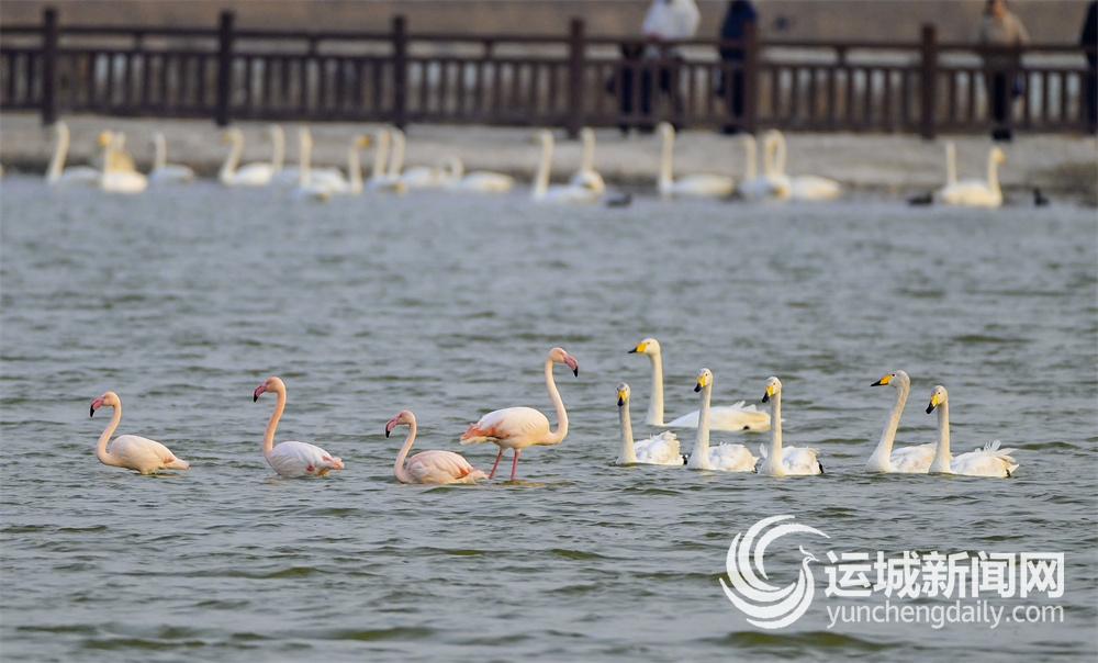 2月6日,4只火烈鸟与上百只白天鹅在运城盐湖天鹅栖息地相遇。红羽映波,白羽弄影,它们和谐相伴、逐水嬉戏,共同绘就了一幅灵动的冬日盐湖唯美画卷。 特约摄影 党永立