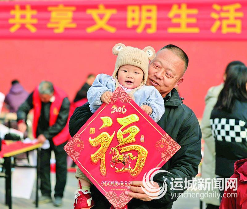2月9日,群众在万荣县“文明集市”上领取“福”字斗方。