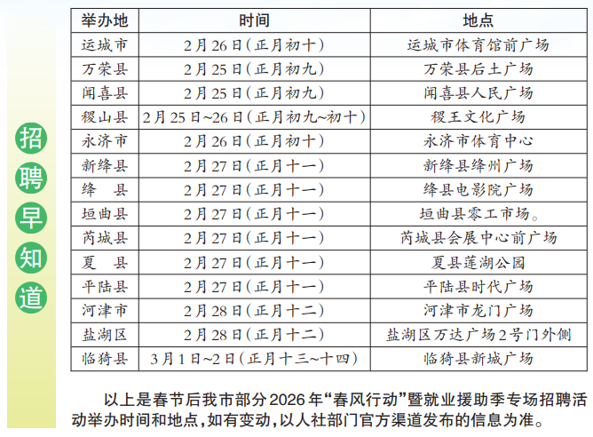 运城晚报讯(记者 范楚乔)随着“就业春风”拂面而来,我市群众就业的万千机遇次第绽放。1月至3月是2026年“春风行动”暨就业援助季,我市各类招聘活动、就业帮扶等陆续开启,尤其是春节后将密集举办多场大型招聘会,为各类求职者释放海量就业机会。