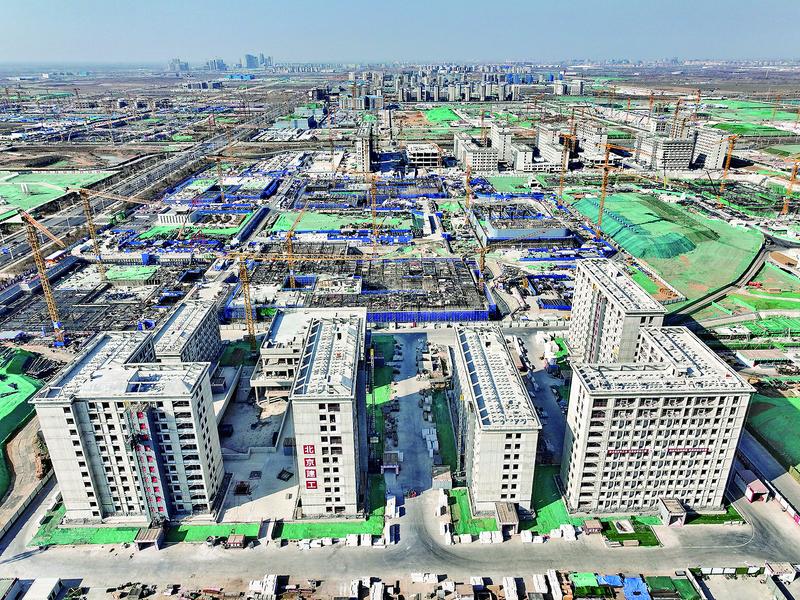 这是位于雄安新区起步区的首批4所疏解高校雄安校区建设现场,由远及近依次为北京交通大学雄安校区、中国地质大学(北京)雄安校区、北京科技大学雄安校区和北京林业大学雄安校区(2月11日摄,无人机照片)。