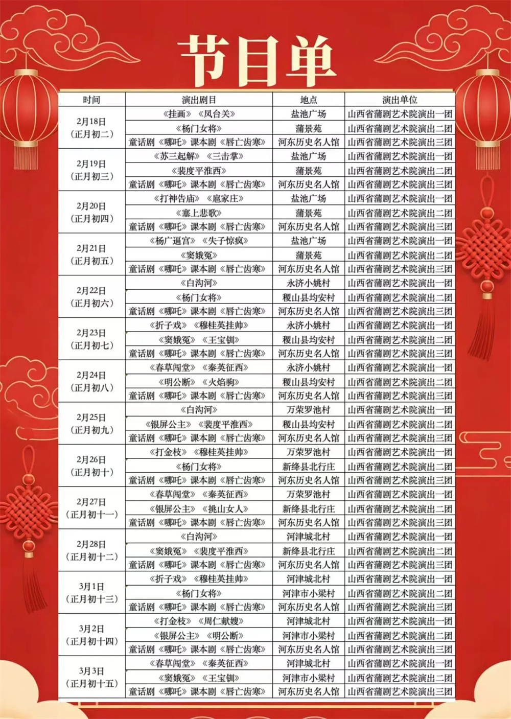 2月18日至3月3日,送戏下乡将走进盐池广场、蒲景苑、河东历史名人馆及各县重点乡镇。经典蒲剧唱响浓浓乡情,趣味童话剧点亮童真笑脸,惠民演出持续登场,让群众在家门口尽享年味十足的文化大餐。
