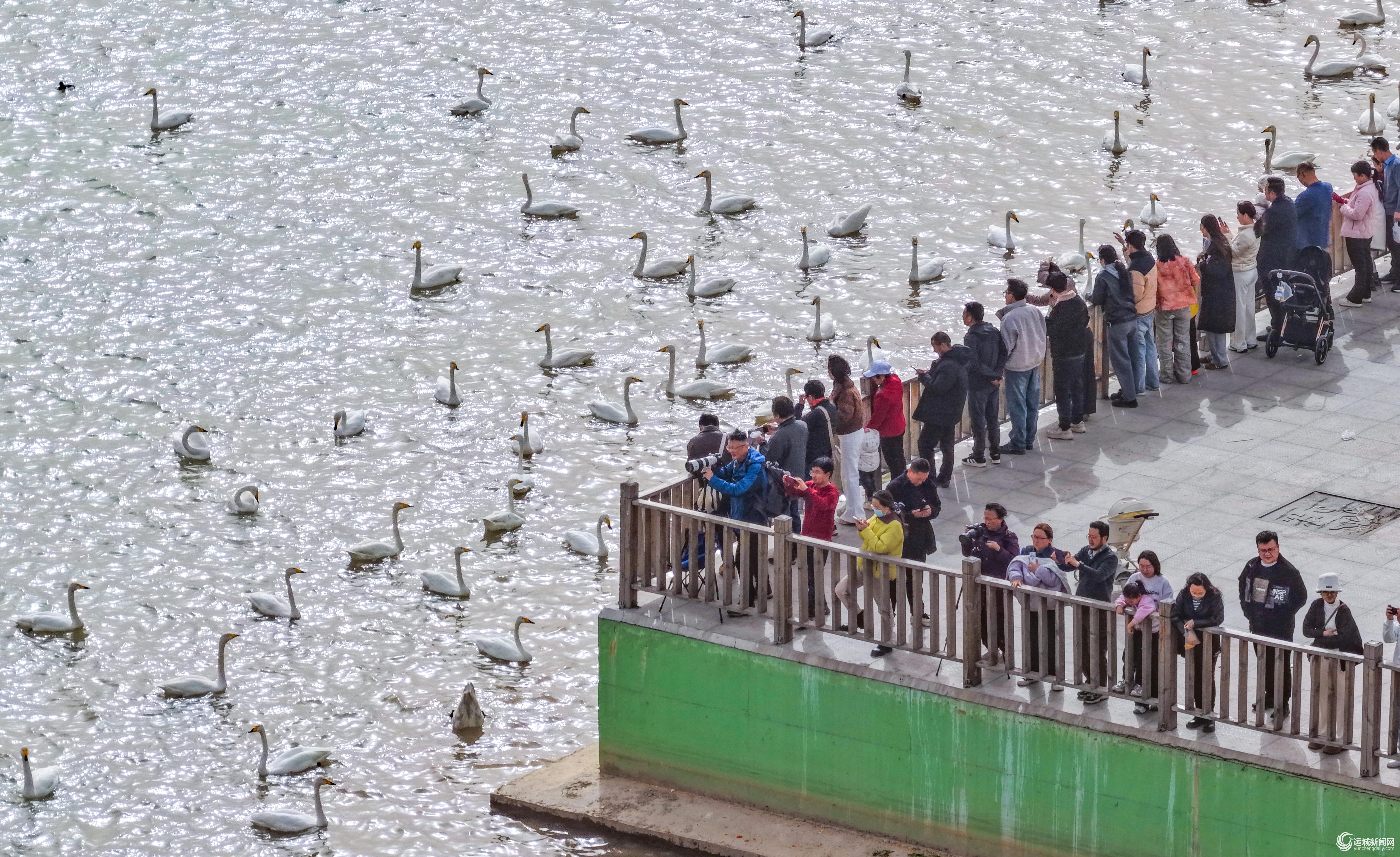 2月22日,游客在平陆县三湾大天鹅景区观赏大天鹅。 本报记者 常 奇 摄