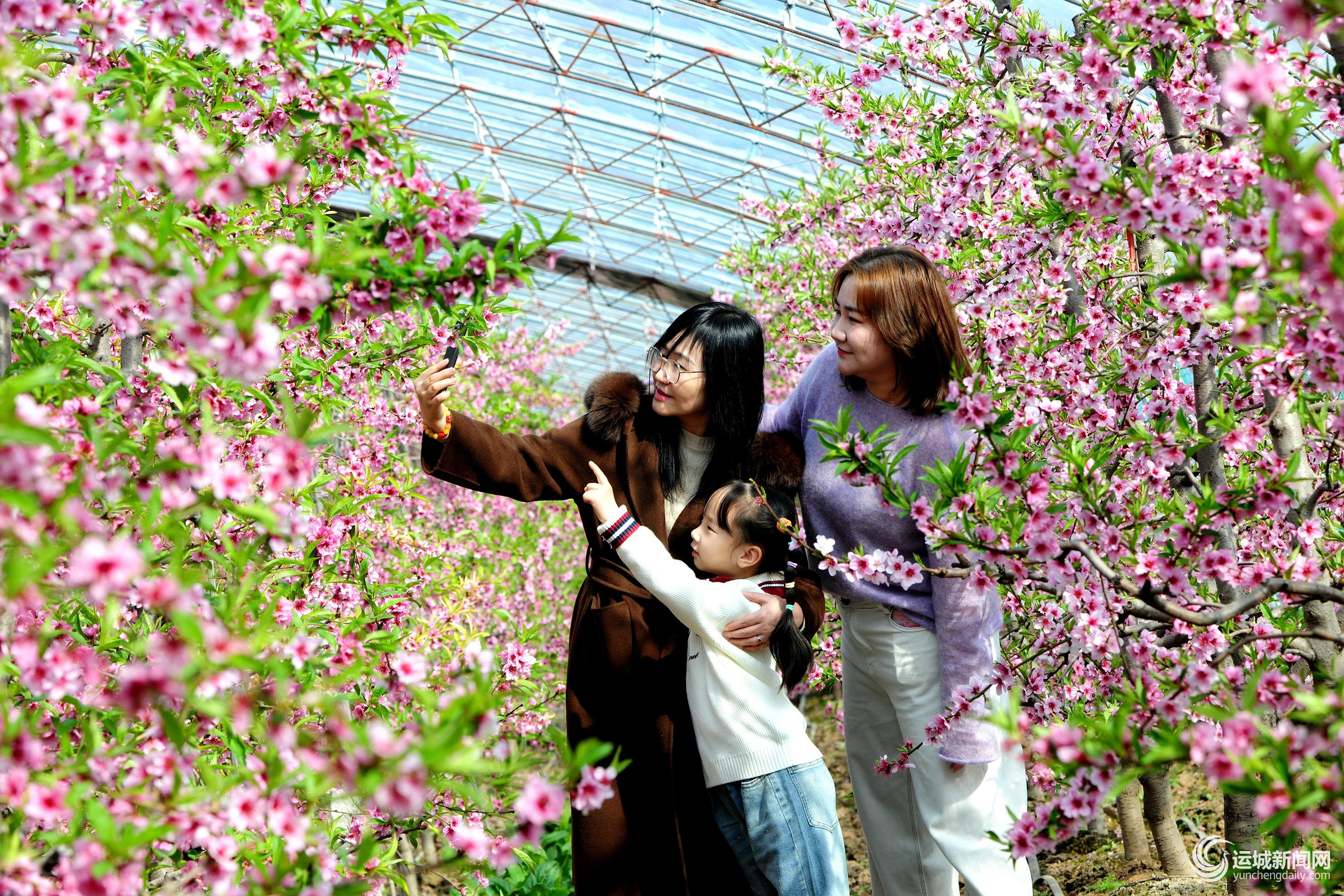 2月18日,游客在万荣县通化镇西孝原村大棚桃园里拍照。