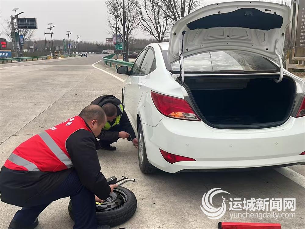 2月21日,一辆外地牌照的私家车刚出站口,右后轮突然瘪了下去,司机一脸焦急,站内的值班班长谢云峰和治超员刘晋文快步上前,一边安抚司机情绪,一边从便民服务点取来千斤顶和换胎工具。拧螺丝、顶车身、卸旧胎、上备胎,十多分钟后,轮胎稳稳落地,车辆重新启动,车主连声道谢。“出门在外,安全最重要。”谢云峰摆摆手,又转身投入车流中。