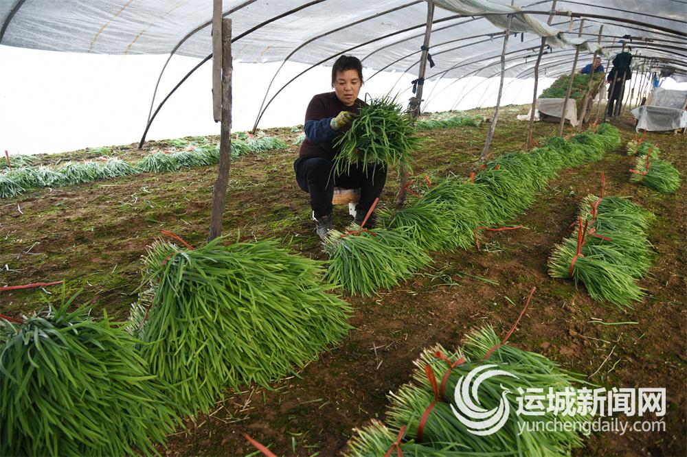 2月28日,闻喜县桐城镇东河口村大棚内,菜农在割韭菜、捆韭菜,以供应市场。