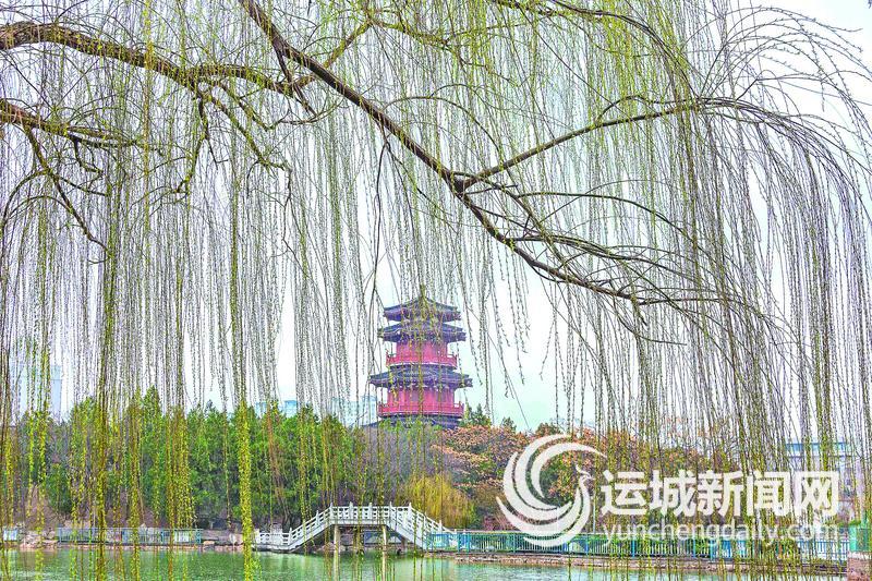 2月28日,中心城区人民公园春潮涌动,垂柳吐绿,与远处的楼阁、碧水相映成趣,一派春意盎然的景象。