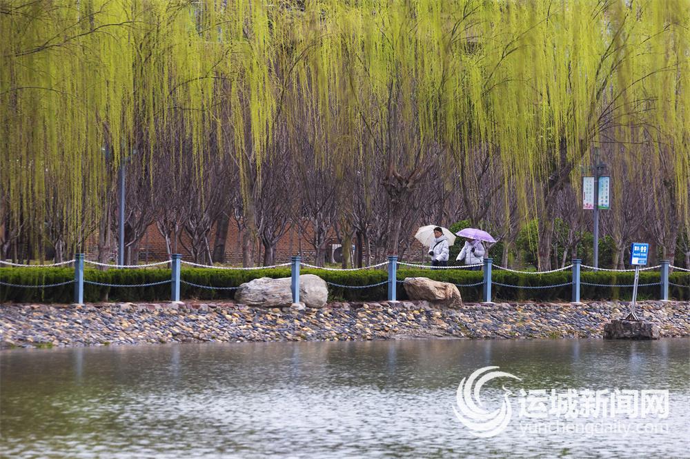 近日,运城市人民公园内,市民在嫩柳吐绿的湖边休闲散步。