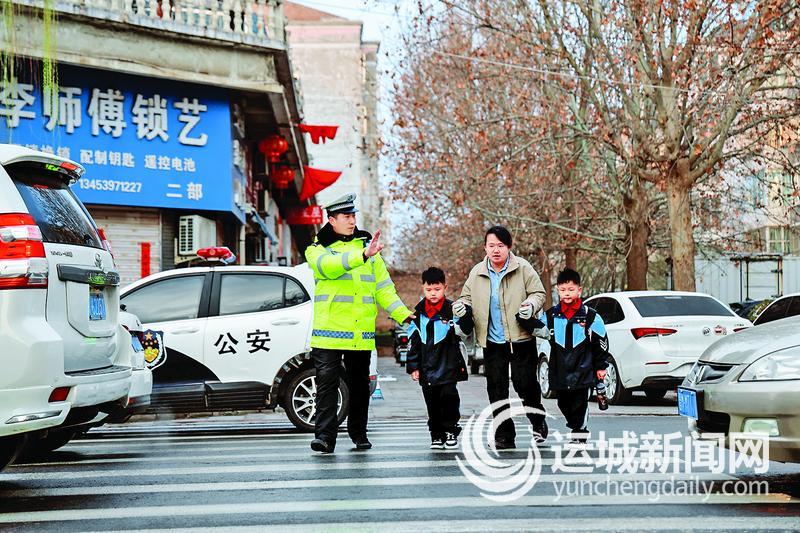当天7时左右,盐湖区魏风小学门口的街道还带着几分早春的凉意,几名民辅警已经提前到岗。他们先在校园附近巡查了一周,仔细查看护栏、警示牌和交通设施是否完好,随后站在各自的岗位上,迎接即将到来的上学高峰。