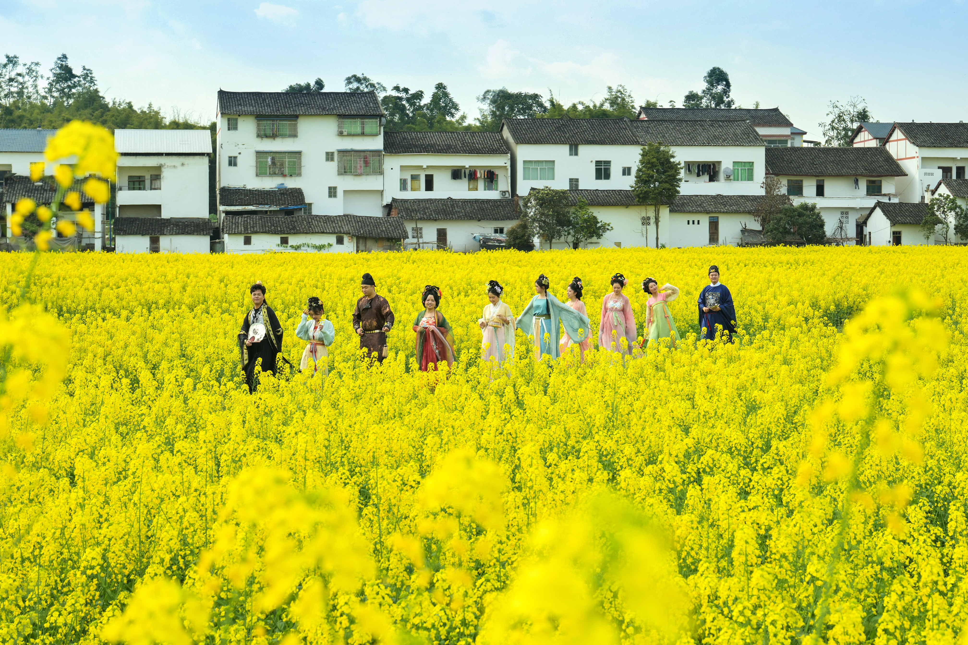 在四川省广安市广安区花桥镇粮油现代农业园区,一群穿着古装的游客油菜花田中游玩打卡。