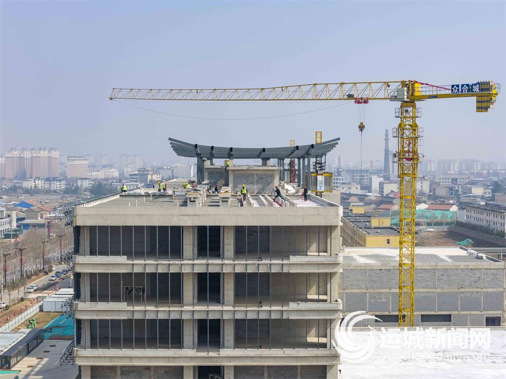 3月11日,万荣县希尔顿花园酒店项目建设现场,工人们正加紧施工。