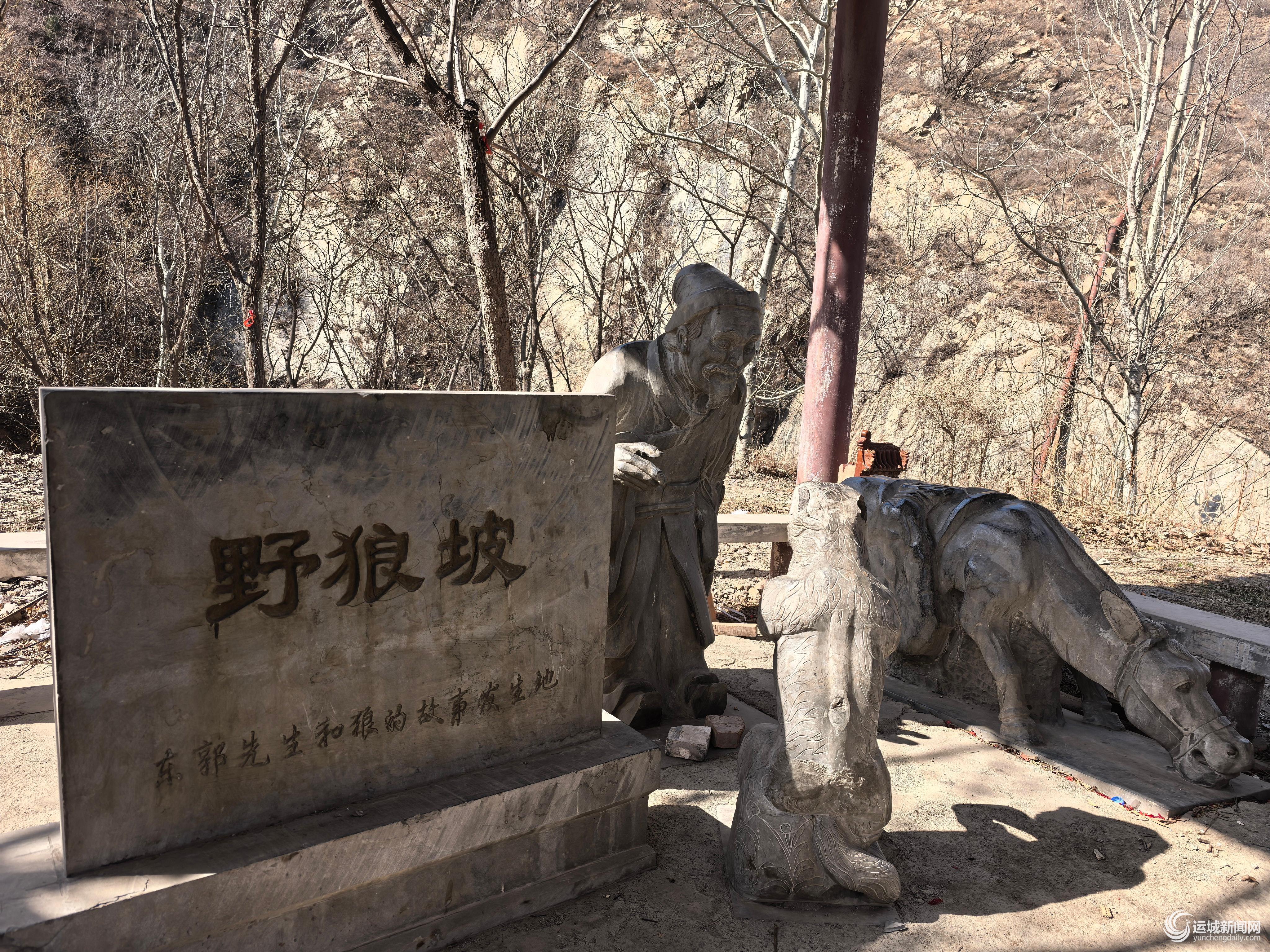 眼前立着一块厚重的灰色石碑,正面刻着“野狼坡”三个大字,下方小字清晰写着“东郭先生和狼的故事发生地”,应是今人新立。石碑旁一组石雕栩栩如生,还原了东郭先生、求救的狼与一头驴的寓言场景,生动传神。
