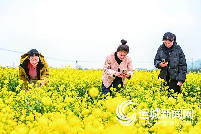 3月23日,市民在盐湖区南城街道西姚村的油菜花田里嬉戏游玩。