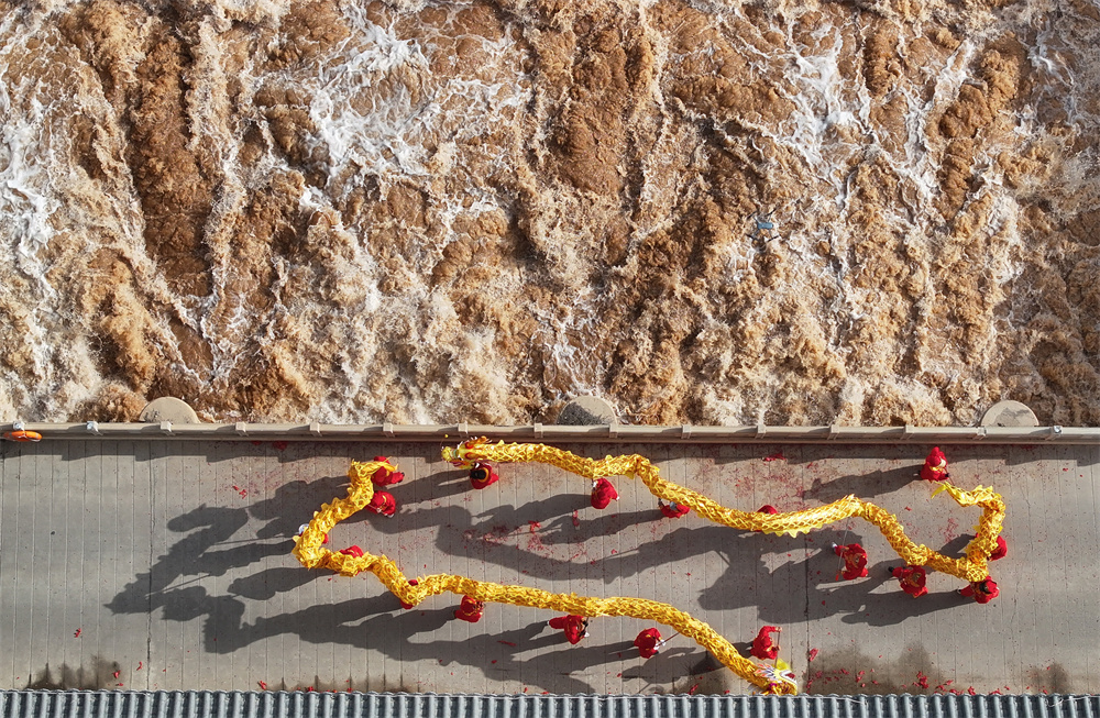 3月24日,位于青铜峡市的唐正闸开闸放水(无人机照片)。
