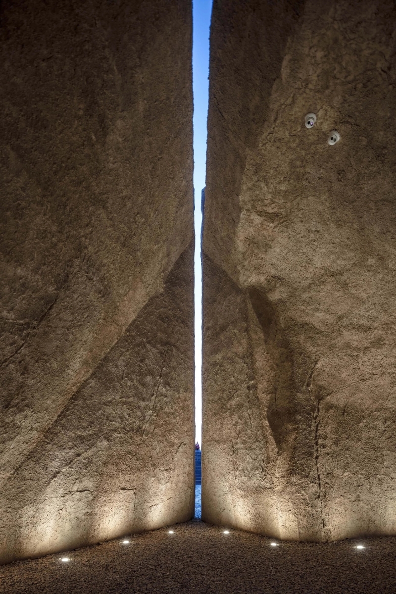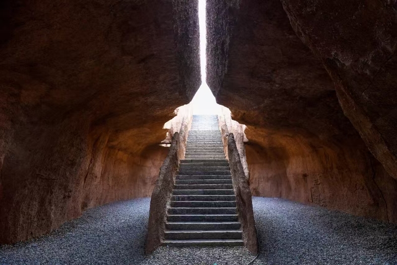 一线天的设计寓意着人类文明的第一道曙光在这里,在二青会圣火采集仪式上,在这里放了一面凹面镜,当9;30分的时候太阳光角度与一线天相重合,采火器中的火苗燃起,在洞穴保存,然后传递到采火台,也是复原了古人取火用火的场景,一线天的设计寓意就是人作为盗火者跟动物的彻底分离, 也是一个生肉到熟食的过程。