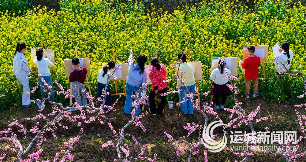 3月25日,夏县一所小学把美术课堂搬进附近村庄田园的花海里,让学生用手中的画笔描绘春天的美景。
