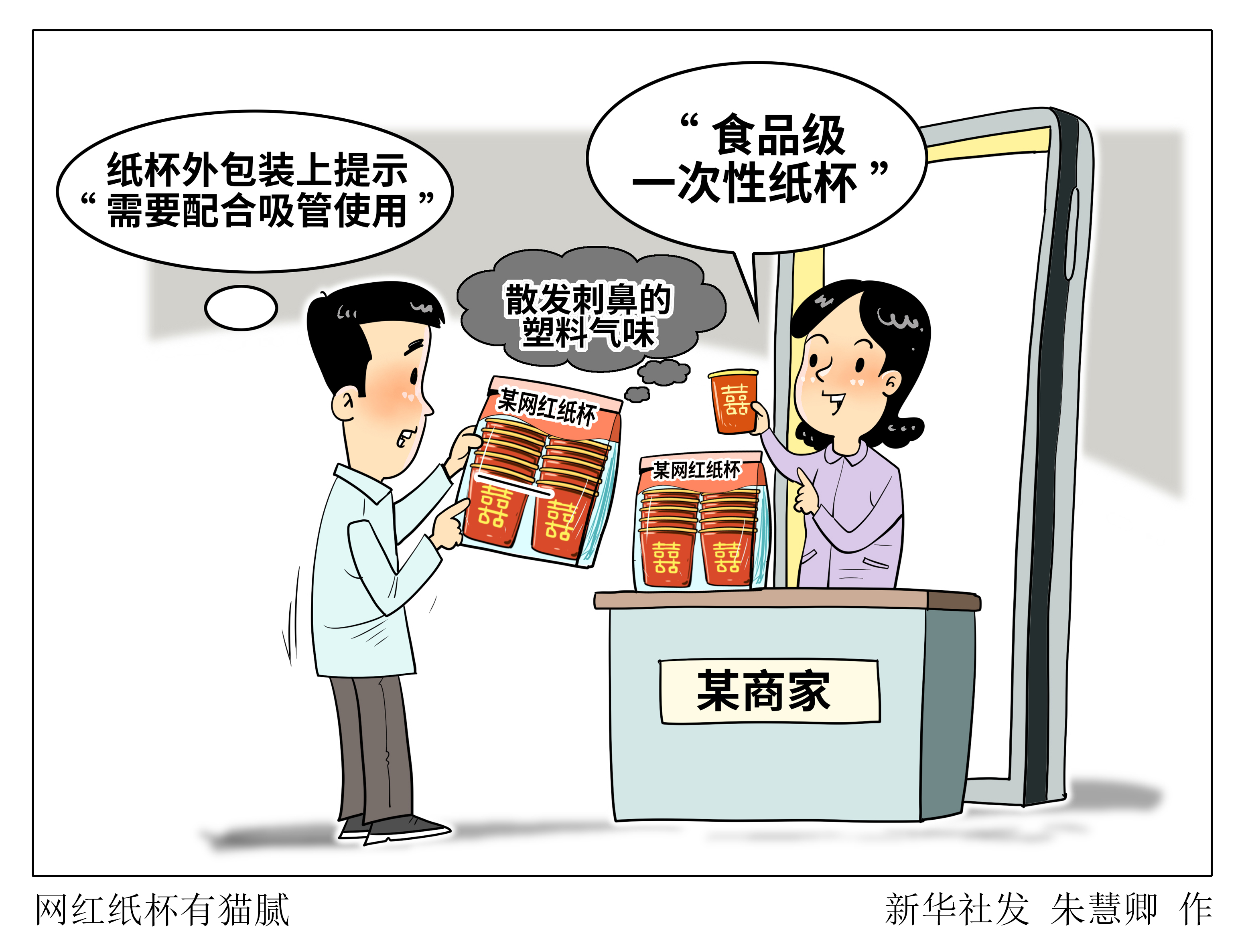 一款“三无”纸杯散发刺鼻的塑料气味,商家却称“正常现象”。明明注意事项写着“需用吸管”,商家却表示无需在意,“直接喝没问题”。