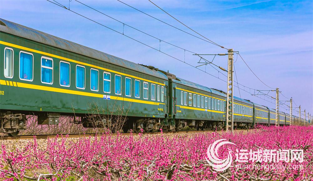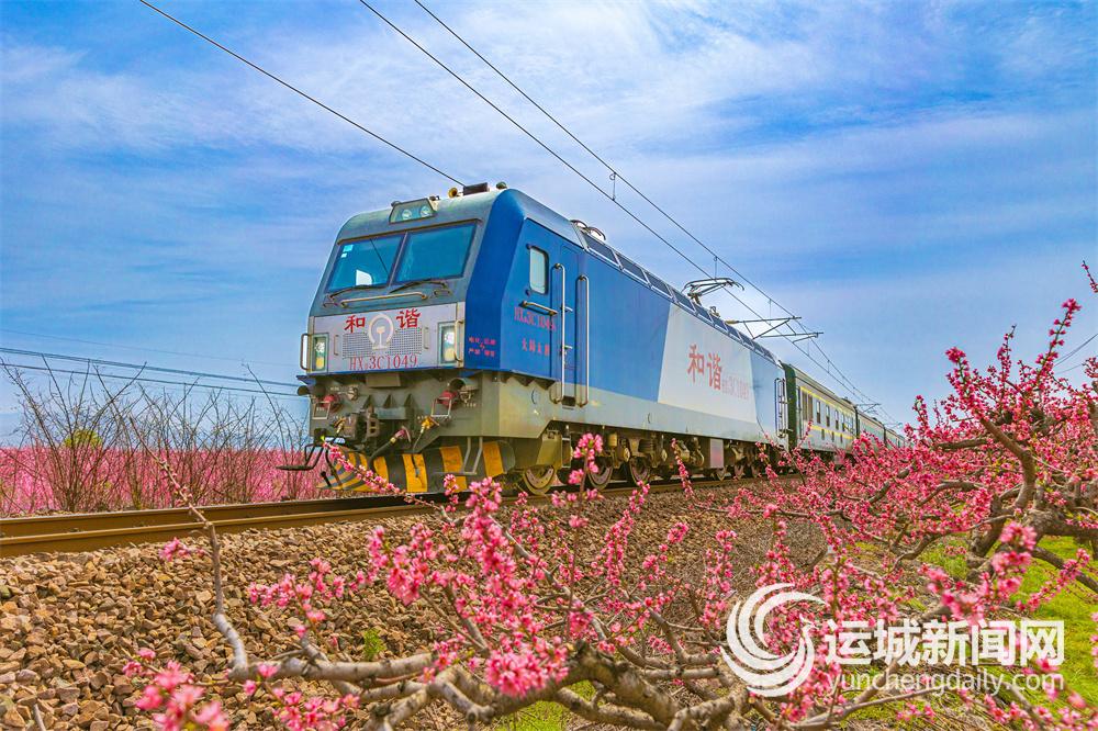 3月29日,盐湖区境内同蒲铁路沿线的桃花岭上,万亩桃花竞相绽放。“和谐”号客运列车从盛放的桃花林间穿过,俨然一幅“车在花中走,人在画中游”的春日画卷。 特约摄影 杨建峰