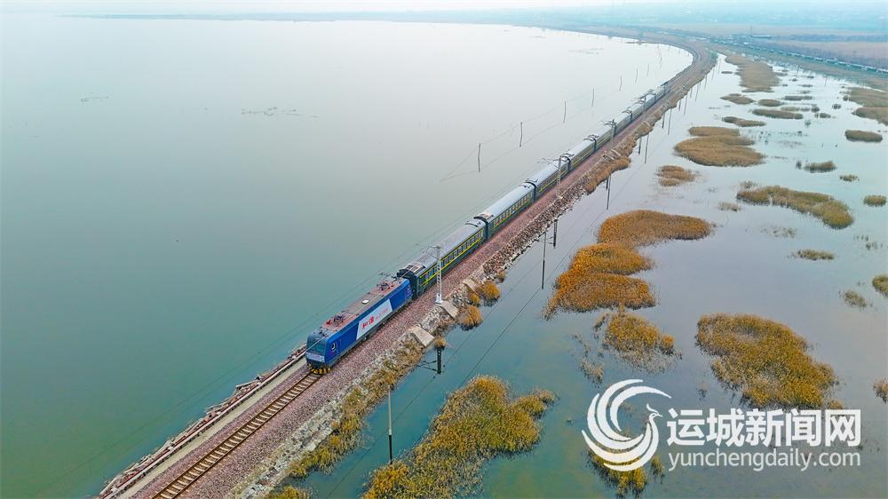 3月24日,在同蒲铁路运城解州段硝池滩,碧波荡漾中,一辆列车穿行于水草间,宛如“水上列车”。列车途经水域形成的独特视觉效果,成为一道亮丽的风景线。