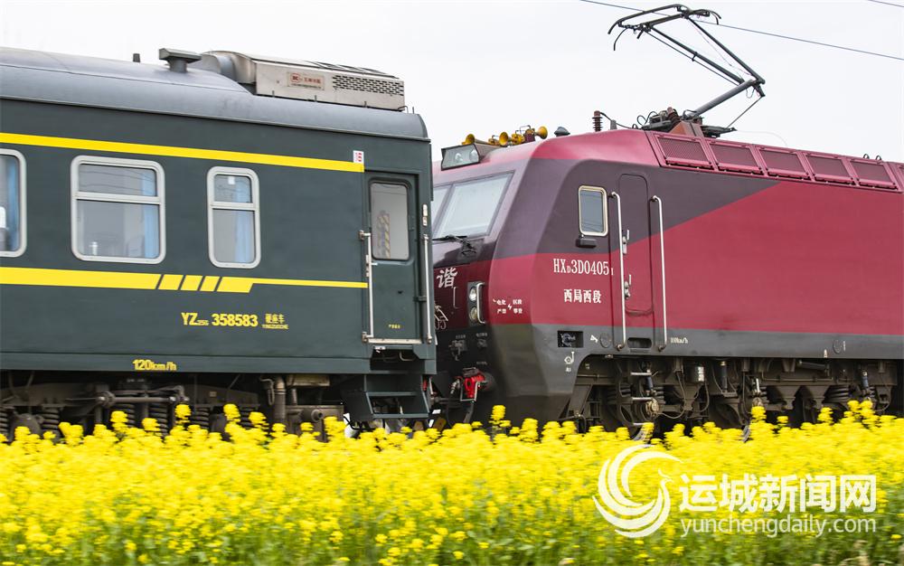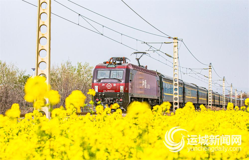 3月25日,“和谐”号客运列车从夏县水头镇的油菜花海通过,红绿两色车身与金灿灿的花田交相辉映,构成一幅流动的画卷,成为春天美丽的“移动风景线”。特约摄影 姚中吉