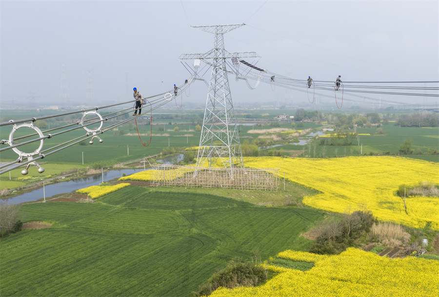 近日,在安徽省芜湖市繁昌区境内,电力工人抢抓春季有利天气,奋战在甘肃—浙江±800千伏特高压直流输电工程施工建设一线,保障能源通道重点工程进度。甘肃—浙江±800千伏特高压直流输电工程是国家“十四五”电力发展规划重点工程,线路全长2370千米,工程贯通后每年可输送电能约360亿千瓦时。