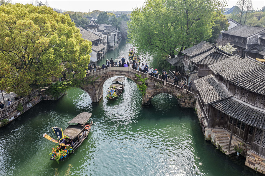 4月1日,乌镇香市蚕花盛会的船队在河道上巡游表演(无人机照片)。
