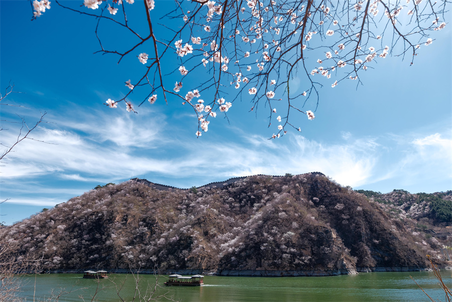 仲春时节,北京怀柔黄花城水长城边,山花竞相绽放,与长城交相辉映,构成一幅壮丽的春日画卷。 新华社记者 陈晔华 摄