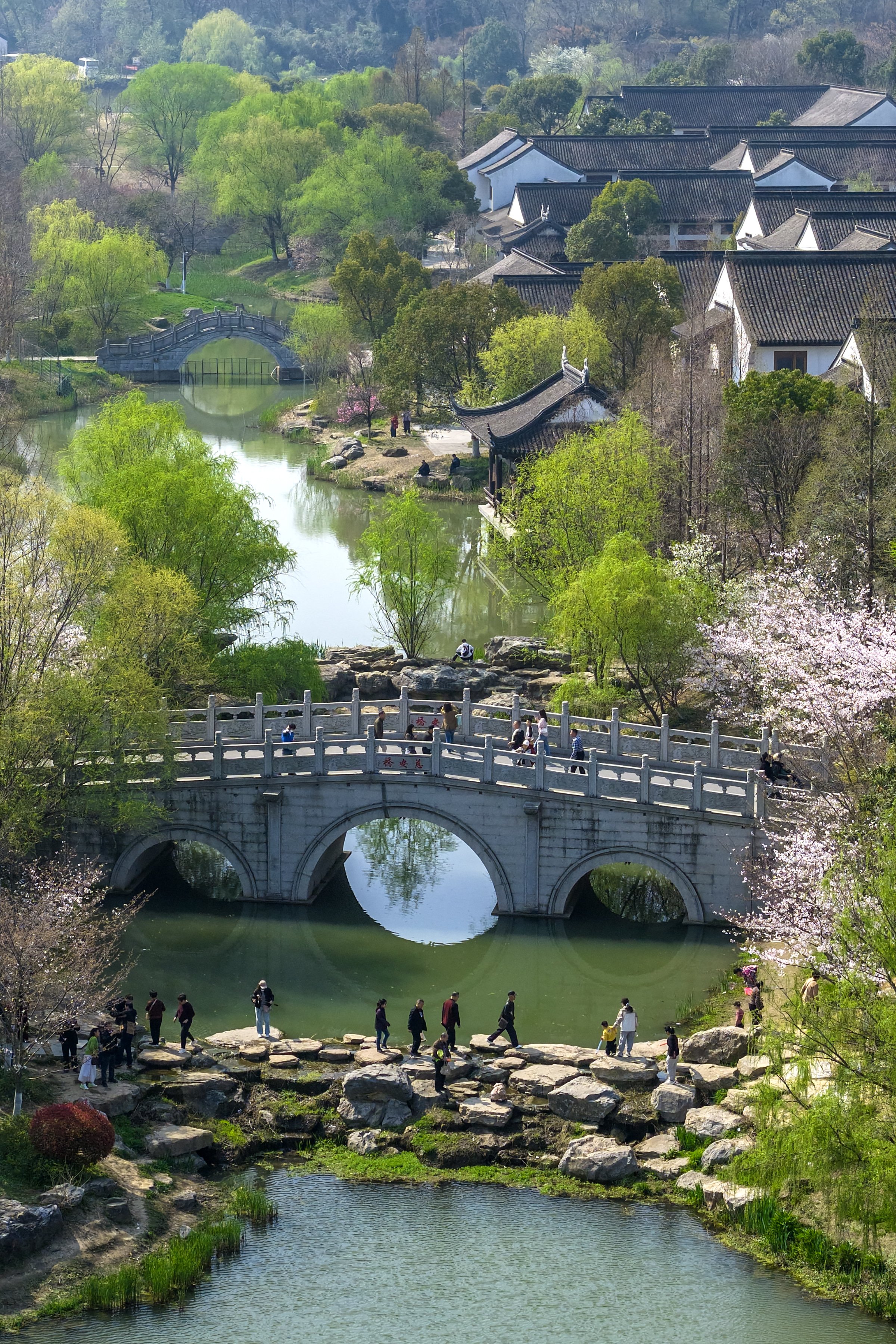 3月29日,游人在江苏省镇江市南山风景名胜区踏青(无人机照片)。