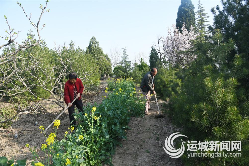 4月2日,闻喜县郭家庄镇太平庄村退休教师王茂山和妻子王秀荣,在他的家庭生态园管理树木。