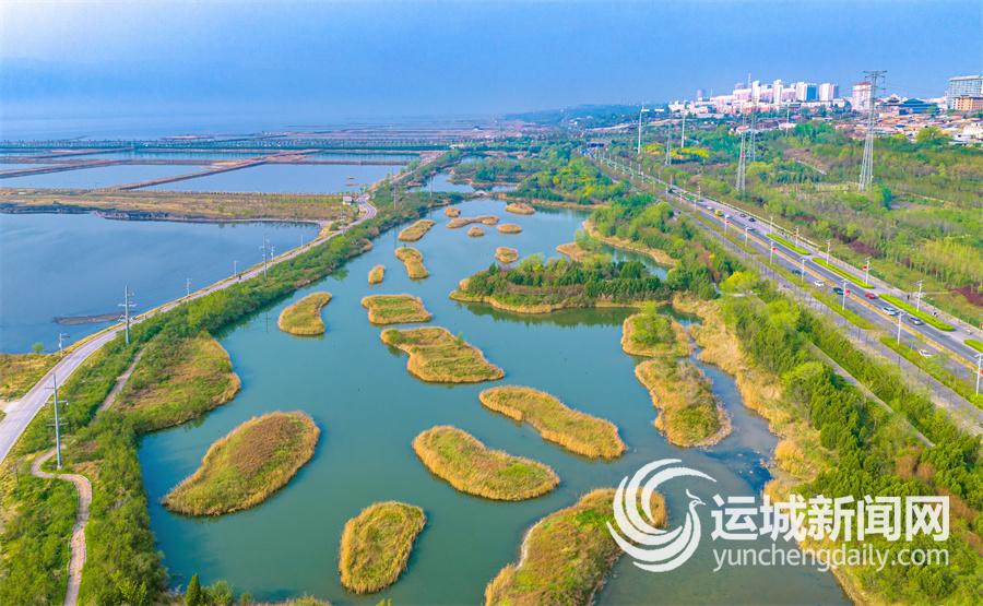 4月3日,空中俯瞰的运城盐湖生态湿地公园春水初生、绿意盎然,一座座“岛屿”与碧水、廊道等构成一幅美不胜收的生态画卷。
