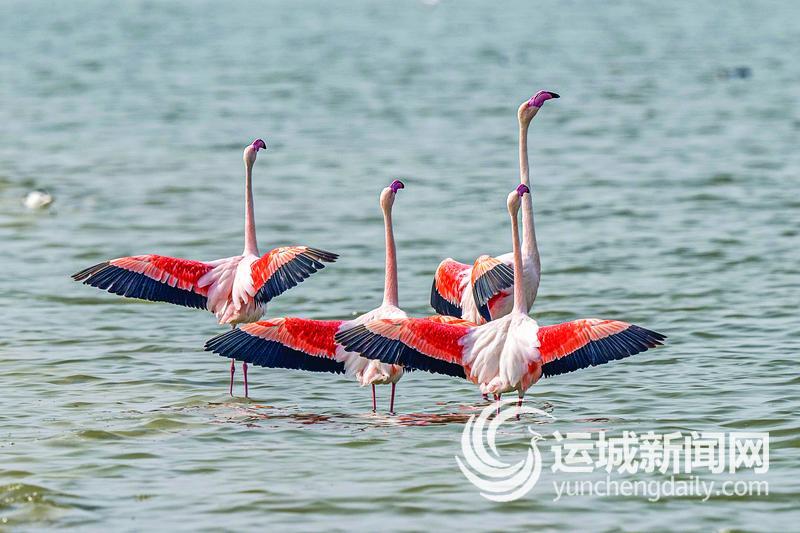 近日,身披朱红羽衣的火烈鸟在运城盐湖漫步觅食。近年来,我市通过实施退盐还湖等生态修复措施,让曾经的盐田重归湿地本色。