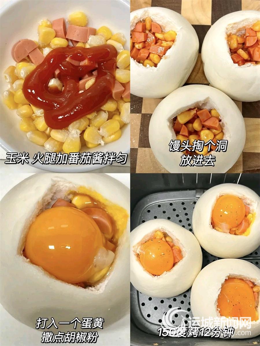 取一整个馒头,先把馒头中间掏空,注意别挖破底部,做成一个小馒头碗的样子就行。接着,往里面随便塞馅料,一般放甜玉米粒、火腿丁,挤上一层番茄酱抹匀,喜欢吃芝士的,还能撒点芝士碎,味道更绝。