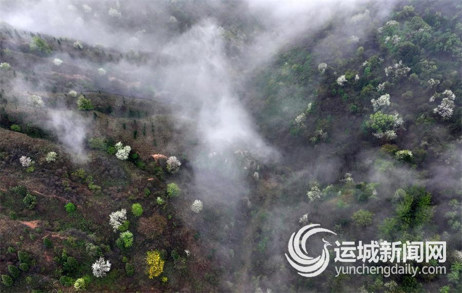 航拍视角下,中条山层峦叠嶂间云海翻涌,如轻纱漫过起伏的山脊。山坡上,成片深绿的林木间,洁白似雪的棠梨花星星点点散布,或簇拥成团,或孤枝绽放,与苍翠植被、赤褐山岩相映成趣。