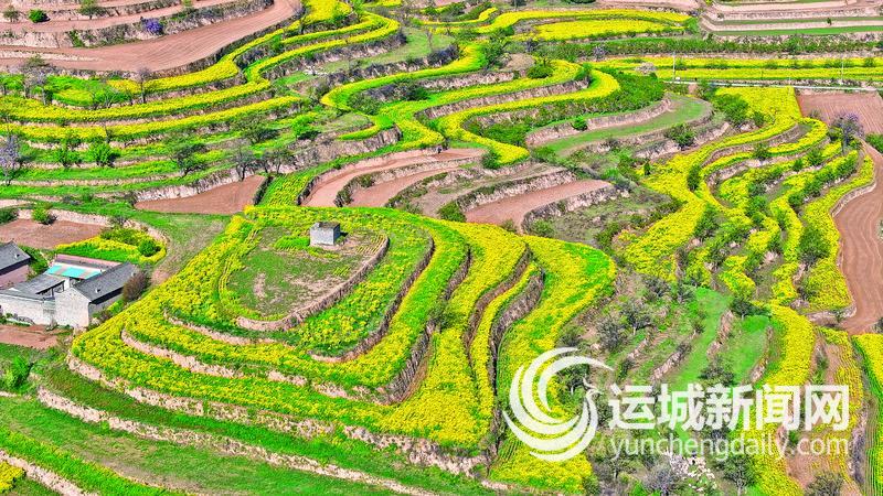 连日来,稷山县太阳乡小阳村梯田上,板蓝根花竞相盛放。从空中俯瞰,犹如铺开的金黄色地毯,构成一幅生机勃勃的乡村振兴画卷(4月10日摄)。