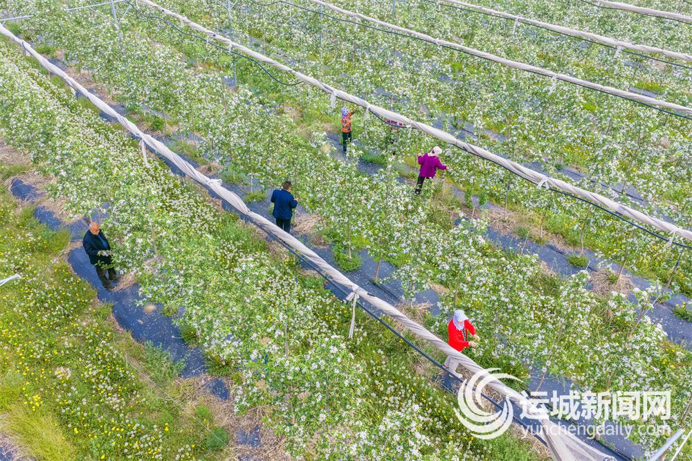 4月12日,在临猗县国家现代农业产业园北景乡峰仙村千亩苹果园内,当地果农抢抓农时,细致察看苹果树开花与长势,有序开展疏花、授粉等管护作业,为今年苹果丰产丰收筑牢基础。特约摄影 杨建峰 摄