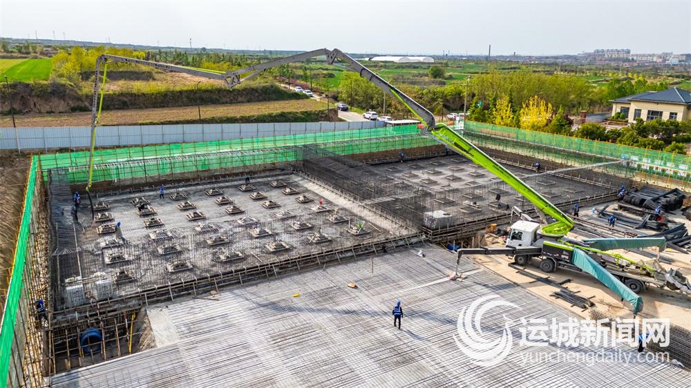 4月16日,在万荣县城乡供水一体化工程(城南供水站)建设现场,工人在抓紧建设提水泵站。