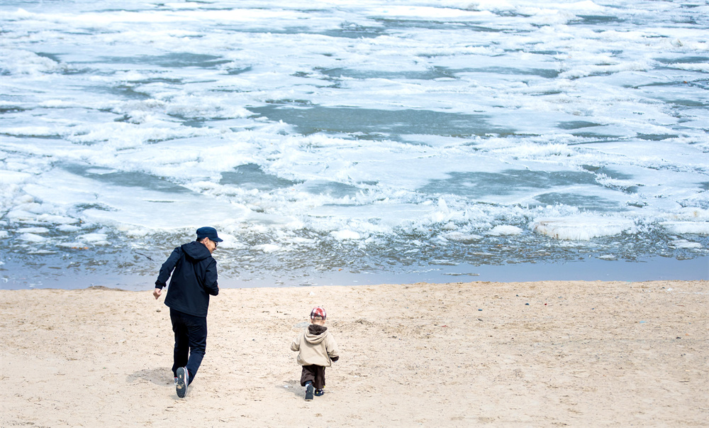 4月17日,黑龙江省抚远市,老人陪着孩子在江边奔跑。