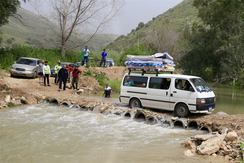 4月18日,在黎巴嫩南部提尔附近的贝迪亚斯,返回家园的人们乘坐车辆经过利塔尼河上的一座临时桥梁。