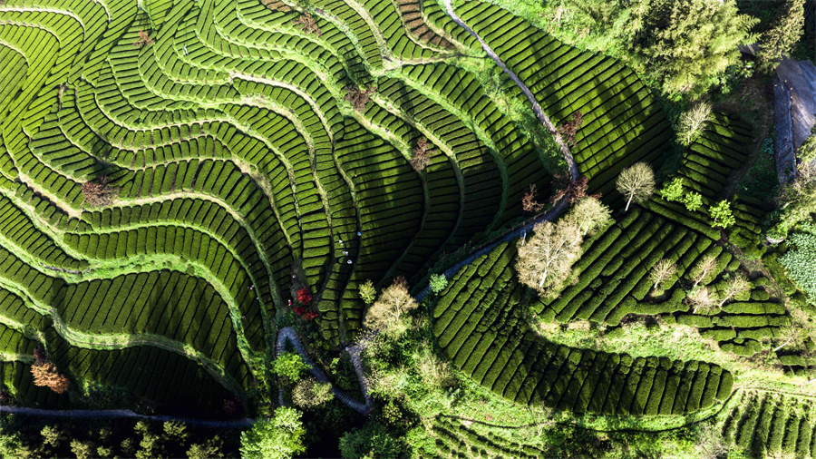 近日,在湖北省恩施土家族苗族自治州恩施市屯堡乡花枝山村,茶农在茶园采摘春茶(无人机照片)。
