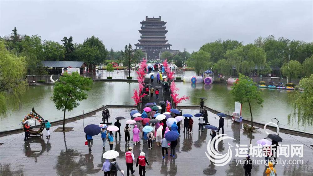 4月21日,永济市鹳雀楼景区细雨绵绵,烟雨氤氲中更显诗意。