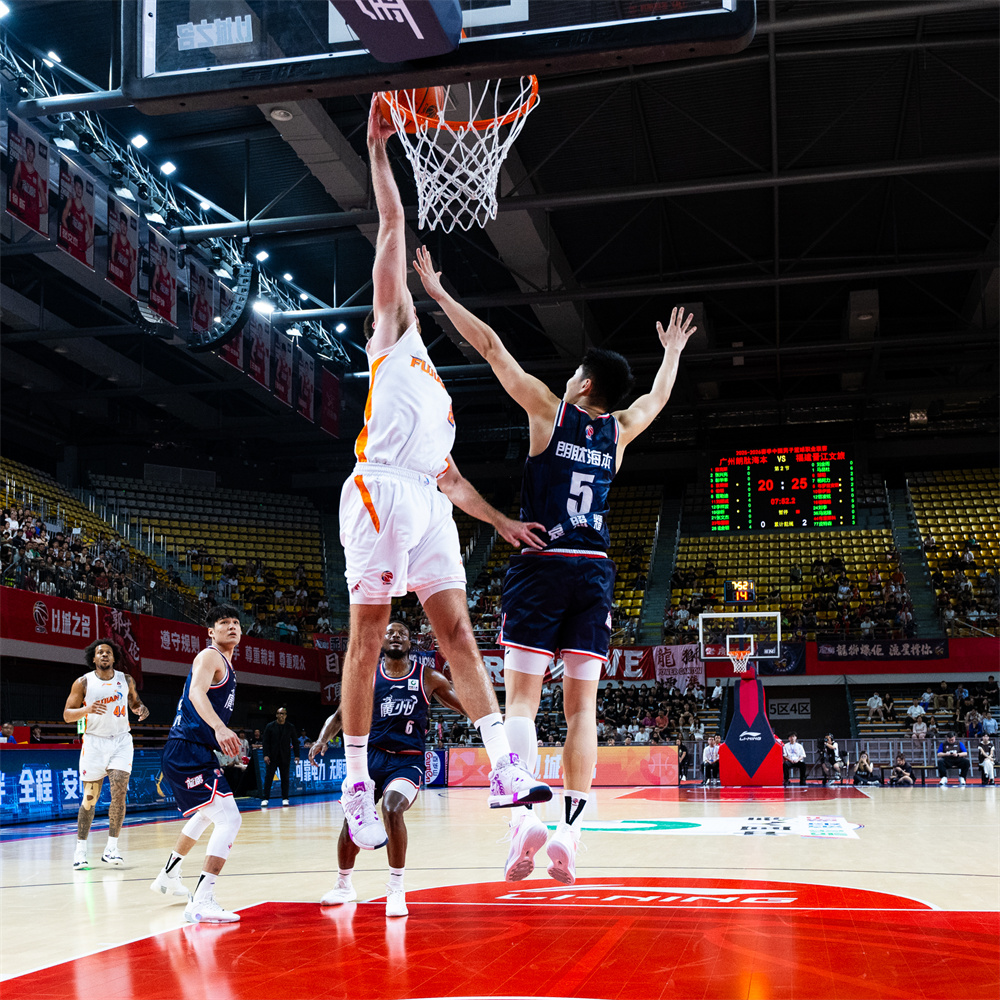 4月20日,福建晋江文旅队球员布罗兹安斯基(上左)在比赛中扣篮。在2025~2026赛季中国男子篮球职业联赛(CBA)常规赛第41轮比赛中,广州朗肽海本队主场101比94战胜福建晋江文旅队。 新华社发(华野 摄)