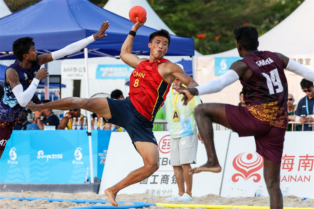 4月21日,在海南三亚举行的第六届亚洲沙滩运动会沙滩手球男子小组赛中,中国队2比0战胜斯里兰卡队。