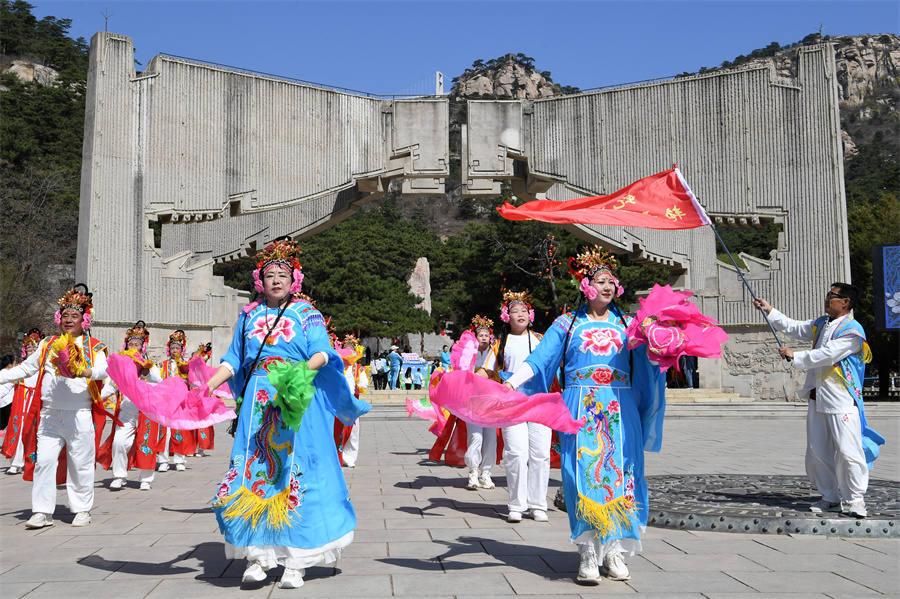 4月23日,在辽宁省北镇市医巫闾山景区,秧歌队在第36届北镇梨花节上表演秧歌舞。