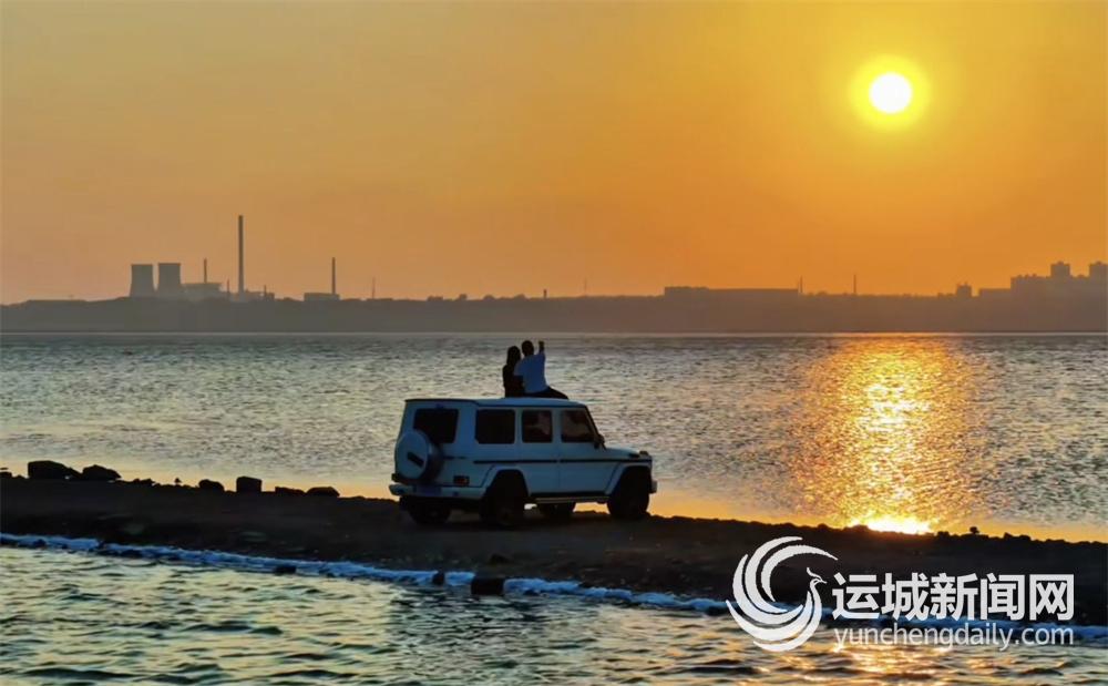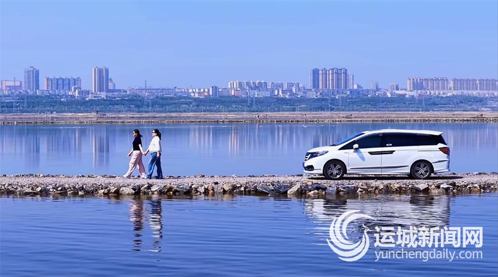 更惊喜的是,步道上还藏着运城版“赛里木湖”路线。沿着碎石路向前,两侧湖水波光粼粼,远处的中条山和城市高楼成了天然背景板。一辆车停在步道上,你和朋友并肩走在车前,镜头从侧方缓缓推进,湖风掠过发梢,湖水泛起涟漪,那种“车在画中行,人在景中游”的治愈感和赛里木湖的公路风光如出一辙。