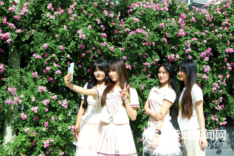 4月24日,市公安局盐湖分局门口,一堵近20米长的蔷薇花墙迎来盛花期。粉紫色的花朵如瀑布般从围墙顶端垂落,与翠绿枝叶交织成梦幻背景,吸引众多市民驻足观赏、拍照打卡。 特约摄影 王哲