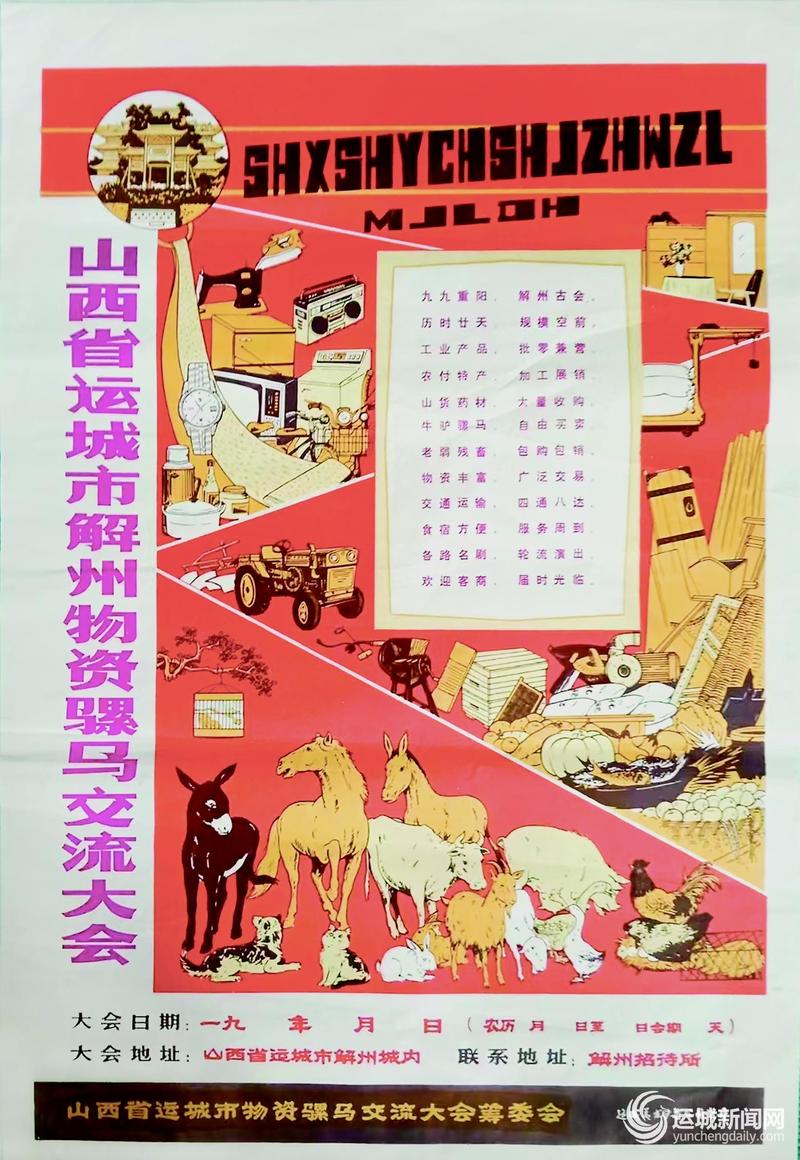 笔者收藏有20世纪80年代“山西省运城市解州物资骡马交流大会”宣传画一张,尺寸为75厘米×53厘米,时代特征显著,以宣传的口吻介绍了活动内容,活动的时间为重阳节,历时20天,规模大,业务范围广,既有工业产品,也有农副产品山货药材等,还有各路名剧轮流演出,解州招待所为与会客商提供餐饮住宿服务。宣传画显著位置的手表、自行车、缝纫机为20世纪80年代中国的“三大件”,是衡量一个家庭生活水平的重要标志。左上角关帝庙的“气肃千秋”牌坊,为点睛之笔,为我们揭示物资交流会与关帝庙的渊源。