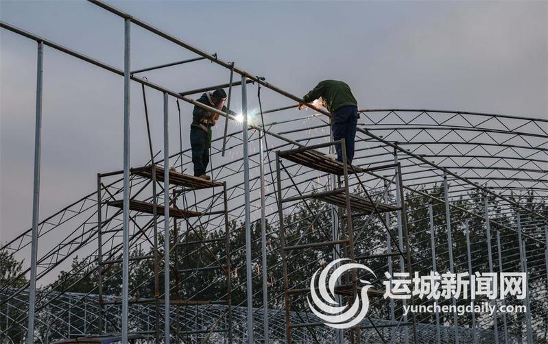近日,夏县埝掌镇埝掌村产业集群项目建设现场,工人在加紧建设日光温室大棚。