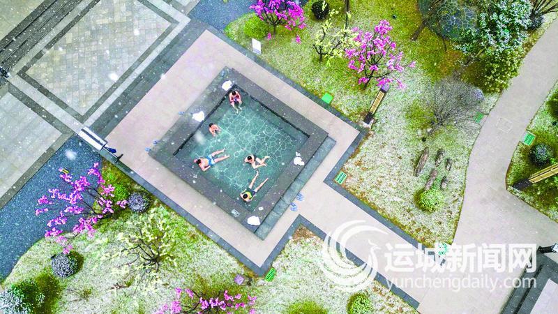在夏都温泉水疗中心,数名游客一边欣赏雪景,一边体验户外温泉。 翟鑫鑫 摄