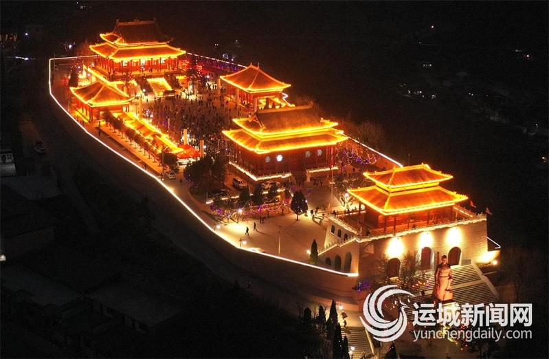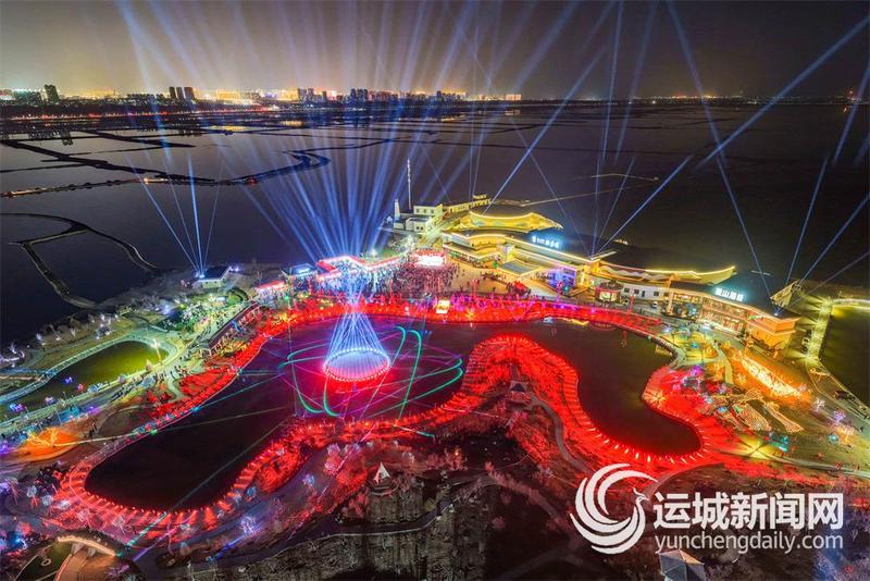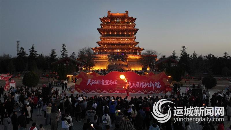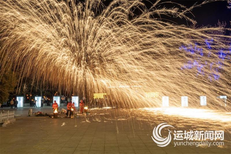 中心城区,运城盐湖景区、河东池盐文化博览园、南风广场等披上光影盛装,花灯璀璨,年味正浓。永济鹳雀楼则以沉浸式夜游惊艳亮相——鱼灯舞灵动、火龙喷火炽烈、篝火晚会暖意融融,无人机光影秀更添科技浪漫,民俗与科技碰撞出一场新春盛宴。闻喜县西湖公园夜灯点亮,亭台楼阁倒映在水面,金斑随涟漪轻漾,满湖灯光与星光共织。平陆县傅相祠凭借“航母”造型的独特魅力,开启夜航模式,灯火与古韵交融如巨舰启航,迅速成热门打卡地;周仓文化园内,铁水腾空的震撼与浓厚的乡土风情交融,既丰富了群众生活,又带火了乡村旅游。